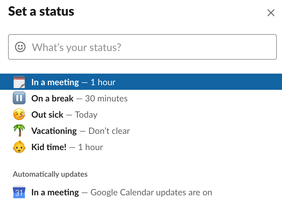 Quickly change your slack status. Or Update your status at the top. At the start of your next calendar.